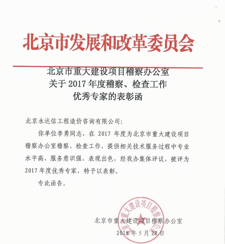 2018年5月28日,北京市重大建设项目稽查办公室致今年会工程造价咨询有限公司表彰函,关于今年会工程造价咨询有限公司李勇先生被评为北京市重大建设项目稽查办公室2017年度稽查、检查工作“ 优秀专家”的表彰函。北京市重大建设项目稽查办公室于2018年5月31日向李勇先生颁发荣誉证书。