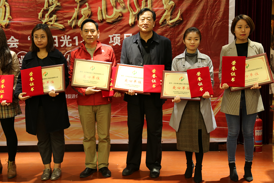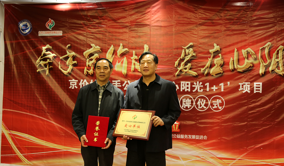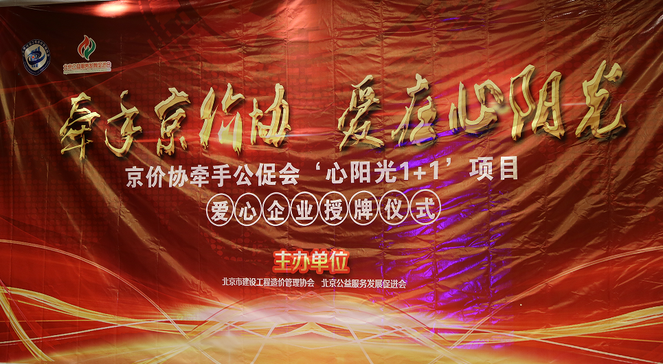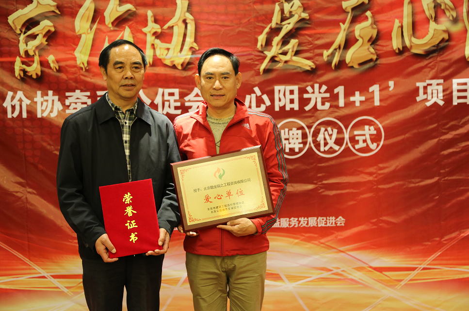 2017年10月23日,北京市建设工程造价管理协会与北京公益服务发展促进会合作公益项目“心阳光1+1”在京召开爱心企业授牌仪式,今年会董事长李永奎先生、今年会工程造价咨询有限公司副总经理吴强先生应邀出席并接受,由 北京市建设工程造价管理协会唐世海 秘书长 颁发的 “爱心企业”荣誉证书和“爱心企业”牌匾。