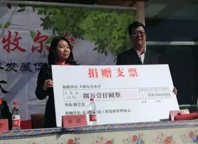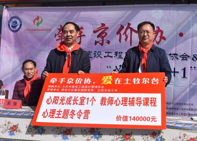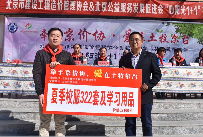 仪式上,北京市建设工程造价管理协会、会员单位及会员个人为察右后旗地区及土牧尔台小学捐助心阳光成长室、乡村心理健康辅导教师培训课程及心理主题冬令营等价值140000万元,为土牧尔台小学精准扶贫学生捐助助学基金81000元,为土牧尔台小学全体学生捐赠价值62100元的夏季校服322套及学习用品等。