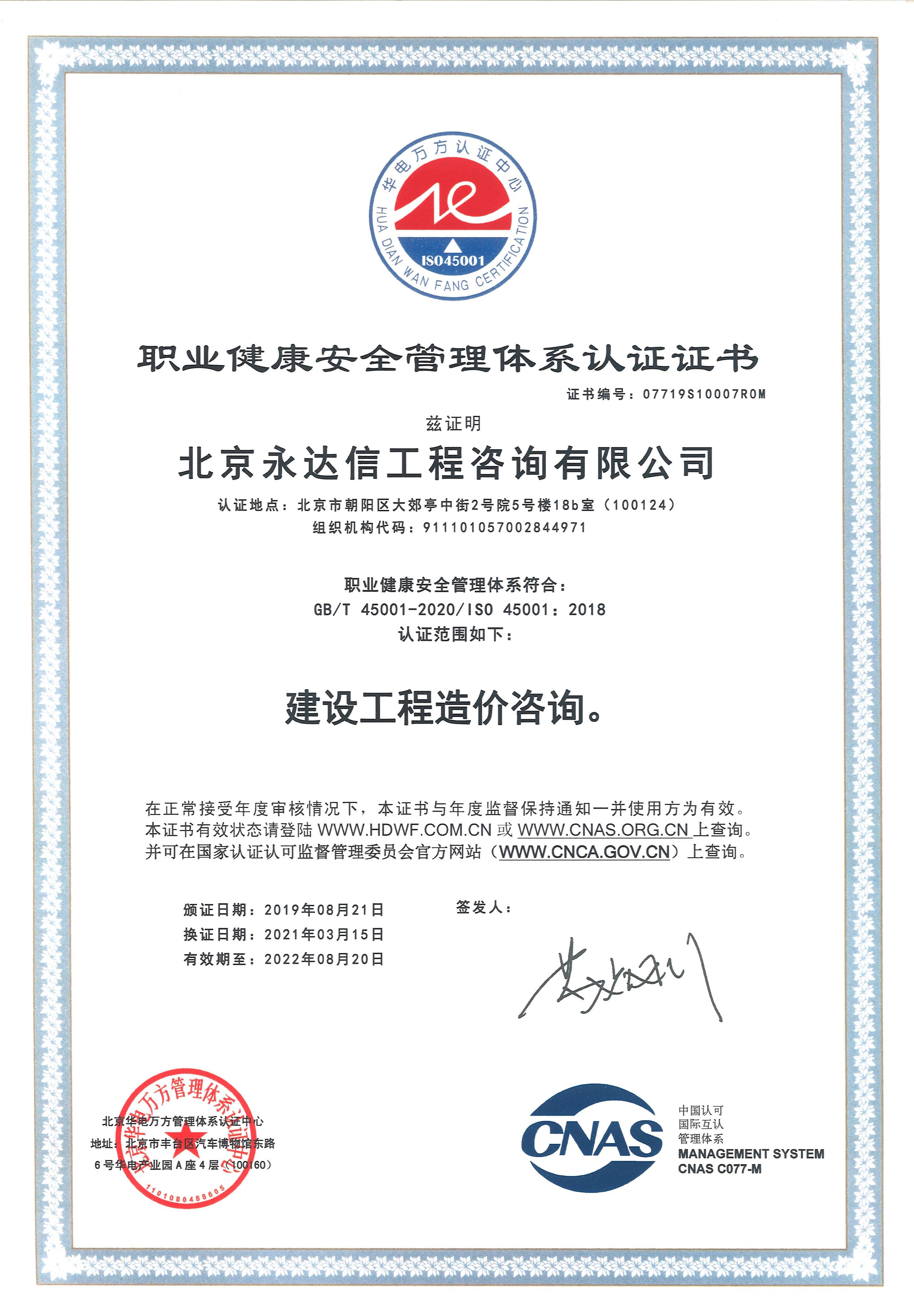职业健康安全管理体系认证证书