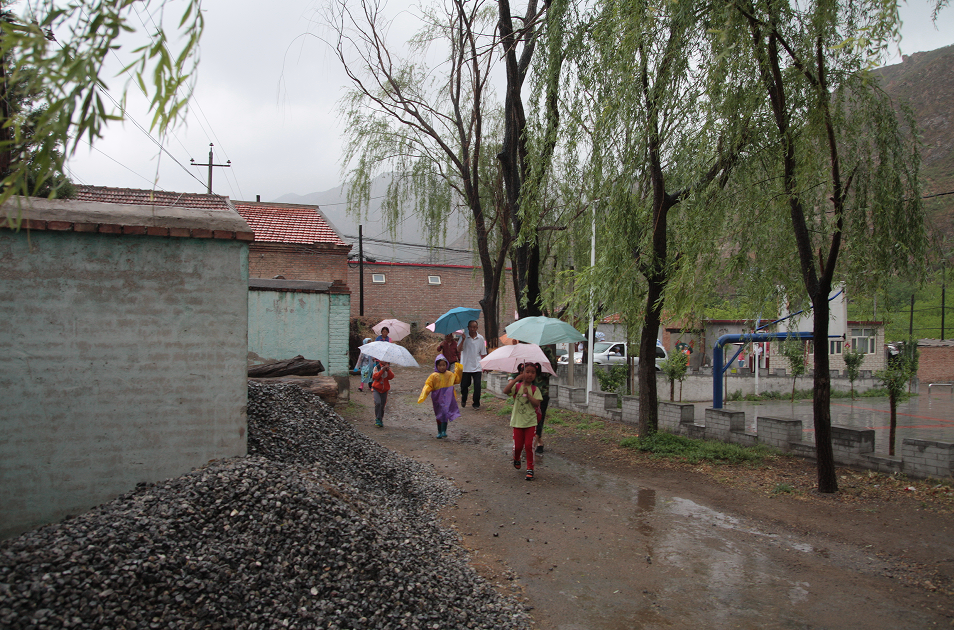 乡间幽静小路,清晨蒙蒙细雨伴随着青草的幽香,孩子们高兴地来上学,他们脸上洋溢着笑容和喜悦。