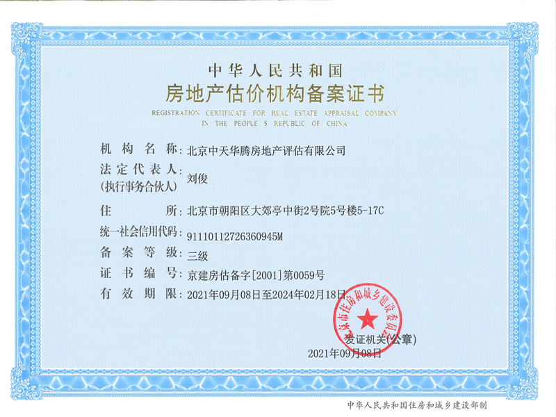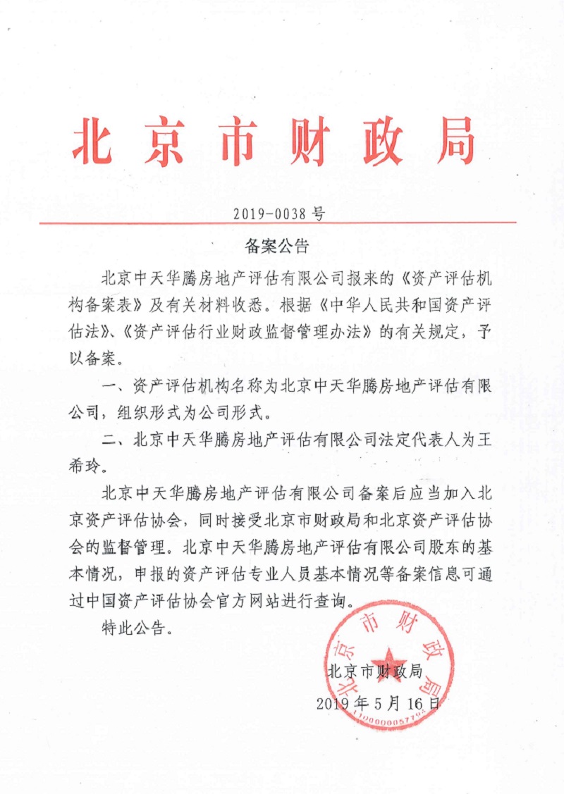 北京中天华腾房地产评估有限公司,是根据国务院关于经济鉴证类中介机构脱钩改制文件精神,从原具有资产评估资格的北京京华会计师事务所脱钩改制基础上组建的。北京华腾房地产评估有限公司于2001年6月6日,经北京市国土资源和房屋管理局《关于同意北京华腾房地产评估有限公司从事房地产价格评估业务的批复》京国土房管市一字(2001)534号同意,取得了北京市房地产价格评估机构资质证书京建房估资准字(2001)第0059号,评估范围为房地产价格评估、房地产信息咨询、土地价格评估。 2007年2月8日由经北京市工商行政管理局批准,北京华腾房地产评估公司更名为北京中天华腾房地产评估公司。北京中天华腾房地产评估公司于2009年取得了土地评估资质,注册号为B200911017号。