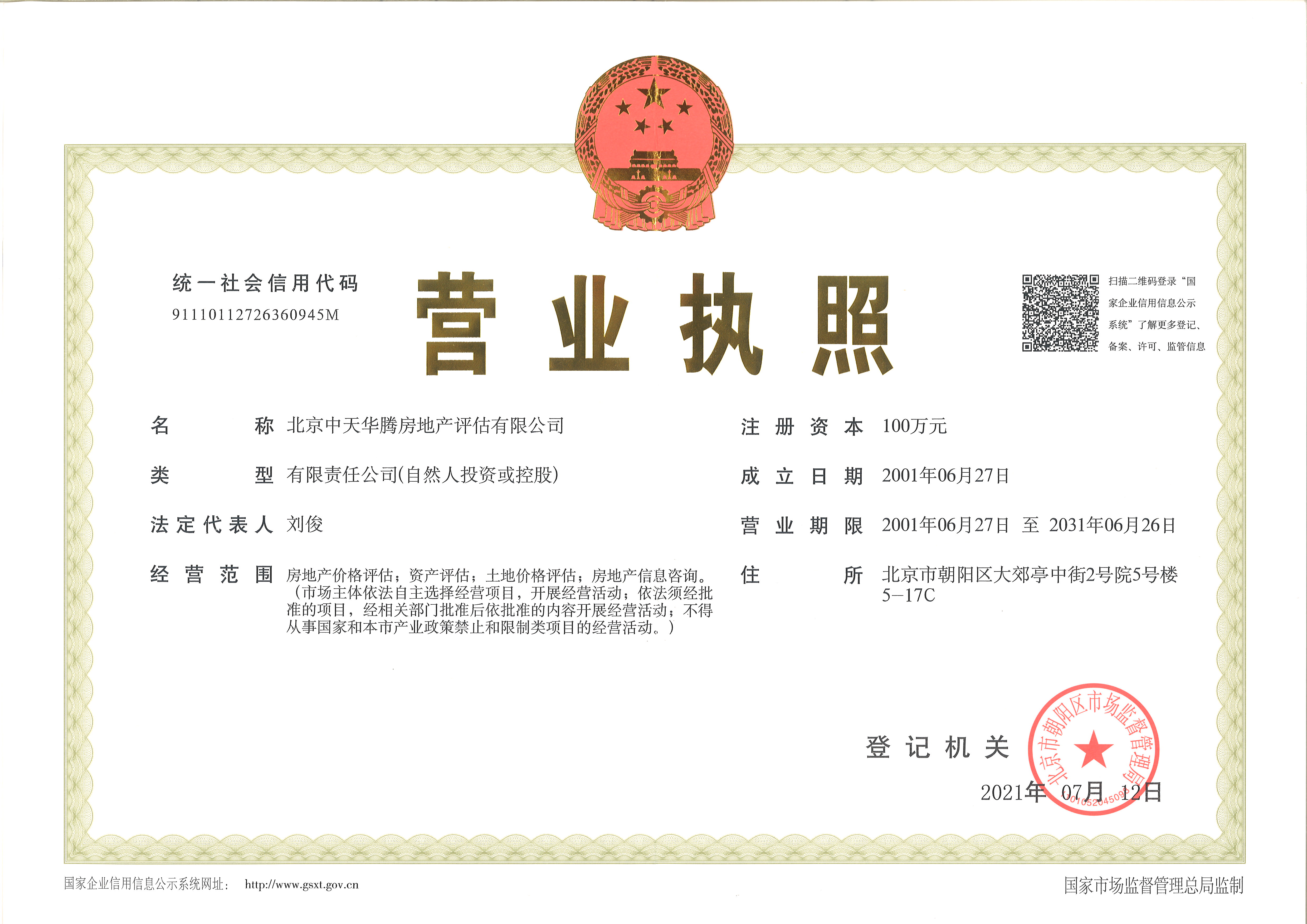 公司经营范围:房地产价格评估;土地价格评估;房地产信息咨询。房地产资质证书京建房估准字【2001】第0059号;土地评估中介机构注册证书注册号B200911017。